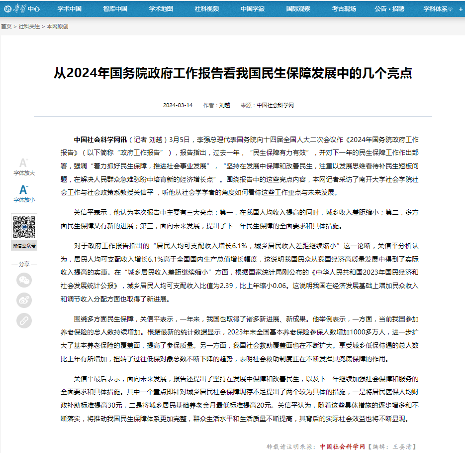 本文作者系betway西汉姆联官网社会建设与管理研究院教授关信平,原文3月14日载于中国社会科学网(从2024年国务院政府工作报告看我国民生保障发展中的几个亮点-中国社会科学网 (cssn.cn))