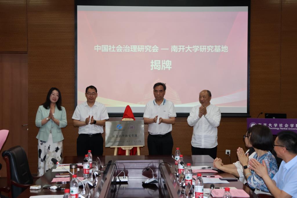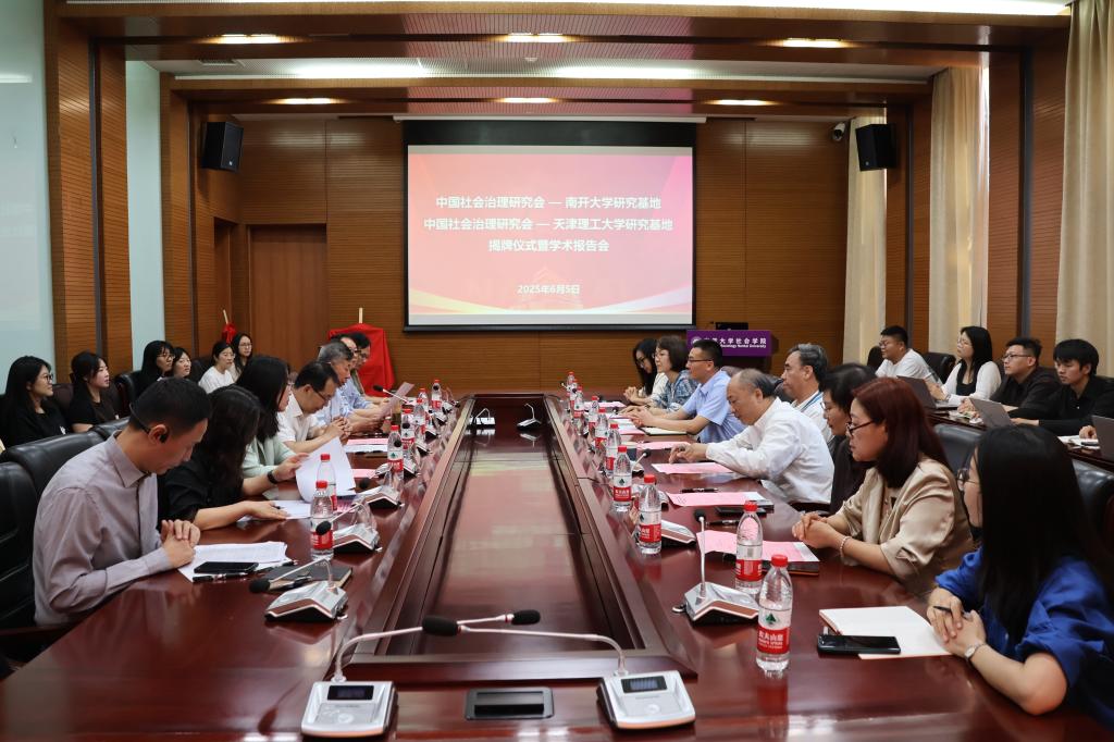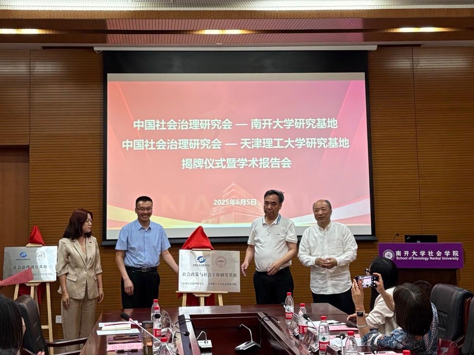 王杰秀会长、朱峰局长、天津理工大学苏荣华副董事长、天津理工大学社会发展学院徐丽敏经理共同为中国社会治理研究会-天津理工大学研究基地揭牌。