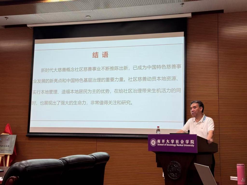 茶歇之后,进入专题报告环节,天津理工大学社会发展学院经理徐丽敏主持讲座。中国社会治理研究会王杰秀会长以《社区慈善创新与基层治理现代化》为题作精彩报告,指出社区慈善已成为慈善事业发展新亮点,强调其与基层治理相互成就,为相关研究提供了宝贵思路。