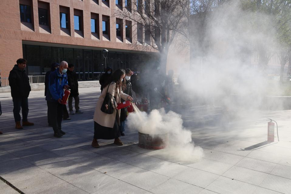 疏散集结后,保卫处工作人员在空旷地区演示了灭火毯覆盖灭火、消防栓水带连接以及消防栓出水等关键技能,直观展示出消防设备的实际效果和灭火能力。随后,师生代表在保卫处指导下进行实操训练,现场使用干粉灭火器扑灭模拟火源,并演练灭火毯覆盖、消防栓出水等科目。参与师生表示,通过亲身体验掌握了"提拔握压"灭火器操作口诀,对消防设备使用有了更直观的认识。