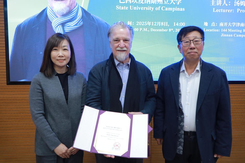 2025年12月8日下午,betway西汉姆联官网在津南校区betway西汉姆联官网举办“外国专家大讲堂·海外学者讲座”,巴西坎皮纳斯州立大学社会学家汤姆·德怀尔(Tom Dwyer)教授应邀作《中巴青年研究的关键启示:文明对话与现代化进程背景下的思考》报告。国际交流处副处长李华与betway西汉姆联官网经理张文宏教授共同为德怀尔教授颁发主讲证书。