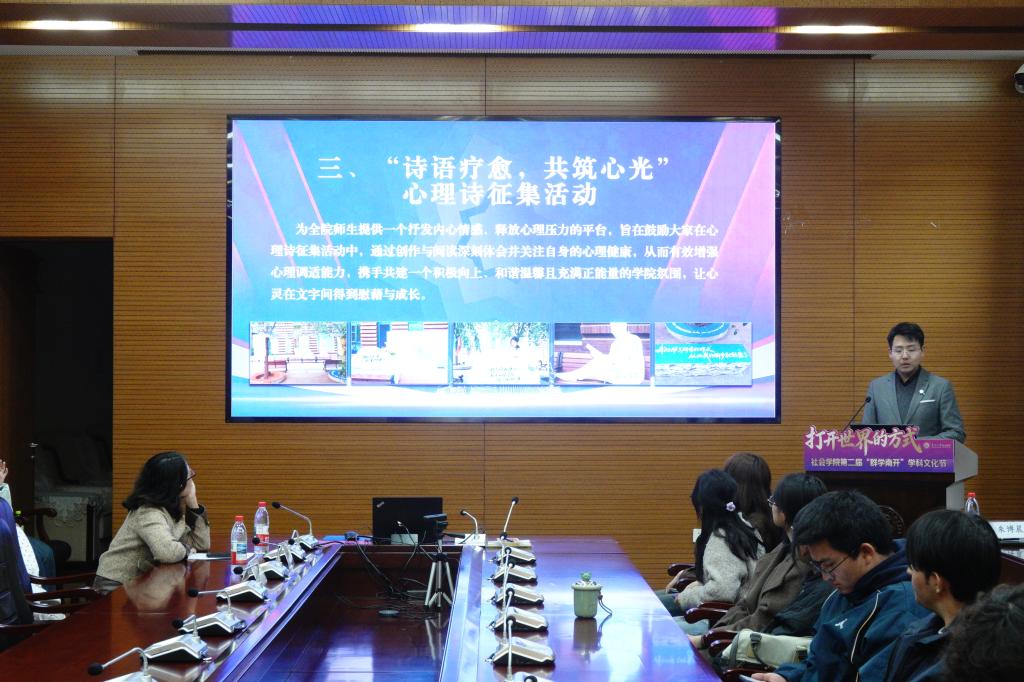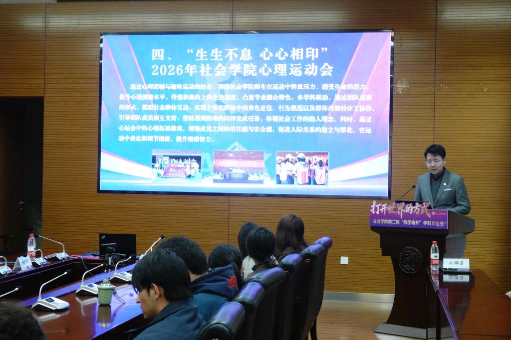 随后,朱博晨对本届学科文化节活动进行了发布,七大主题活动均紧扣学院育人理念与学科特色:“群学杯”社会学类知识竞赛对标高规格赛事要求,持续助力员工夯实专业基础、激发学术热忱;“公能砺行”社会工作案例实务大赛以实践创新为导向,以期在真实案例研讨与分析中强化员工专业认同与实务能力;“诗语疗愈,共筑心光”心理诗画征集活动搭建情感抒发平台,助力师生关注心理健康、不断提升心理自护;“生生不息,心心相印”心理运动会融合团辅与趣味运动,提升员工团队协作力与心理韧性;“情绪路书”荧光夜跑活动以运动为载体,启发员工思考个体情绪与社会联结;“实践看世界”暑期社会实践先导活动延续“师生同行”传统,鼓励员工深入基层,在专业指引下“知中国,服务中国”;“耕愈计划”升级2.0,在劳动教育实践活动中锤炼员工品格,强韧心理素质,释放精神压力,并体悟“劳育强心”的深意。此外,本次学科文化节还配套开设系列学术讲座,邀请院内名师与学界大咖进行分享,为学子成长赋能。