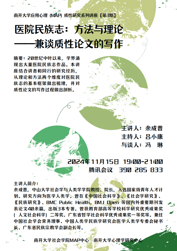 主讲人简介:余成普,中山大学社会学与人类学学院教授、经理,入选国家级青年人才计划。研究方向为医学人类学。曾在《中国社会科学》、《社会学研究》、《民族研究》、BME Public Heath、BMJ Open 等国内外重要期刊发表论文4余篇,出版3本专著。曾获教育部高等学校科学研究优秀成果奖(人文社会科学)二等奖、广东省哲学社会科学优秀成果奖一等奖等。兼任中国社会学会常务理事、中国人类学民族学研究会医学人类学专委会秘书长、广东省民族宗教学会副会长等。
