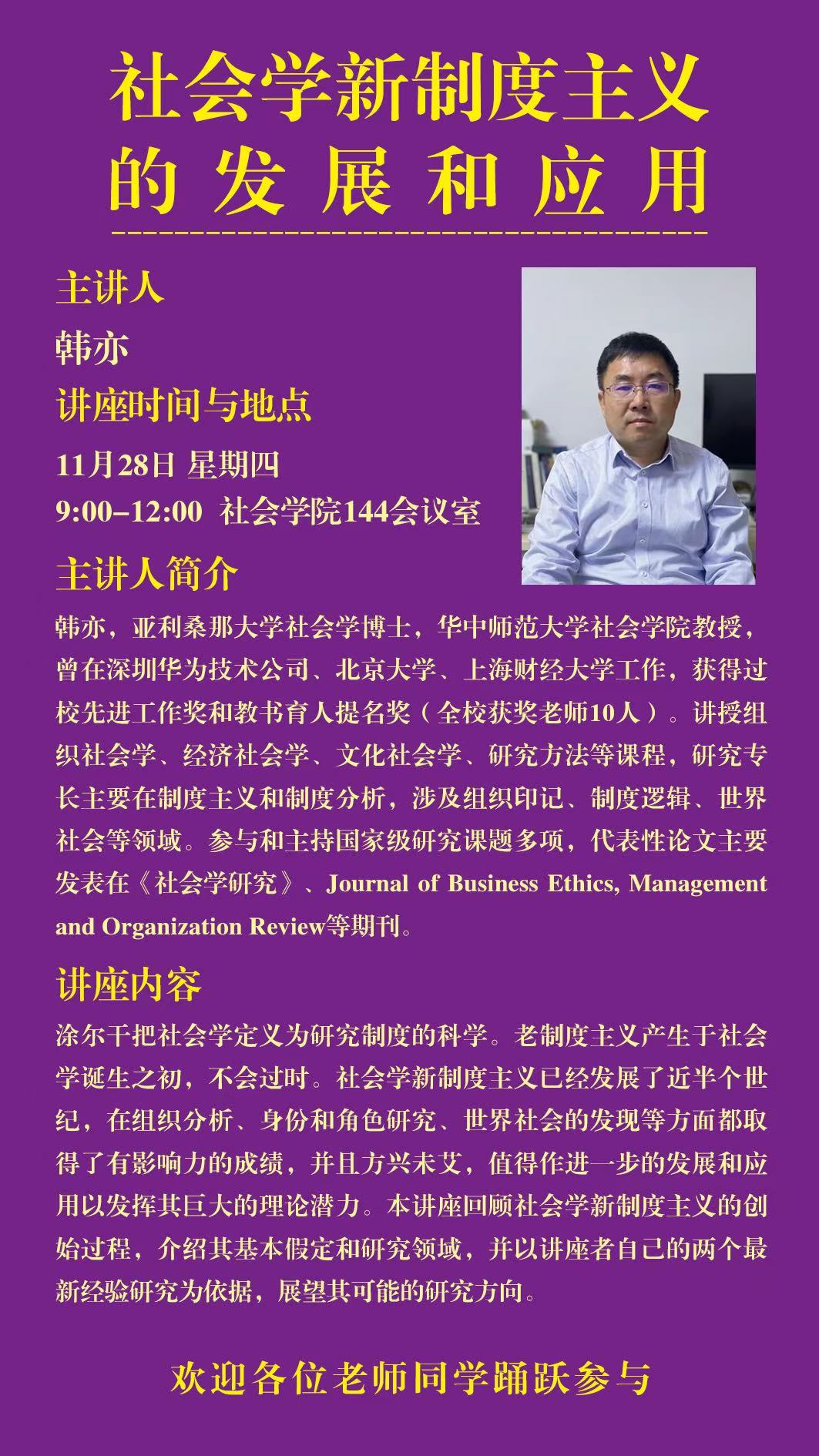 韩亦,亚利桑那大学社会学博士,华中师范大学betway西汉姆联官网教授,曾在深圳华为技术公司、北京大学、上海财经大学工作,获得过校先进工作奖和教书育人提名奖(全校获奖老师10人)。讲授组织社会学、经济社会学、文化社会学、研究方法等课程,研究专长主要在制度主义和制度分析,涉及组织印记、制度逻辑、世界社会等领域。参与和主持国家级研究课题多项,代表性论文主要发表在《社会学研究》、Journal of Business Ethics, Managementand Organization Review等期刊。