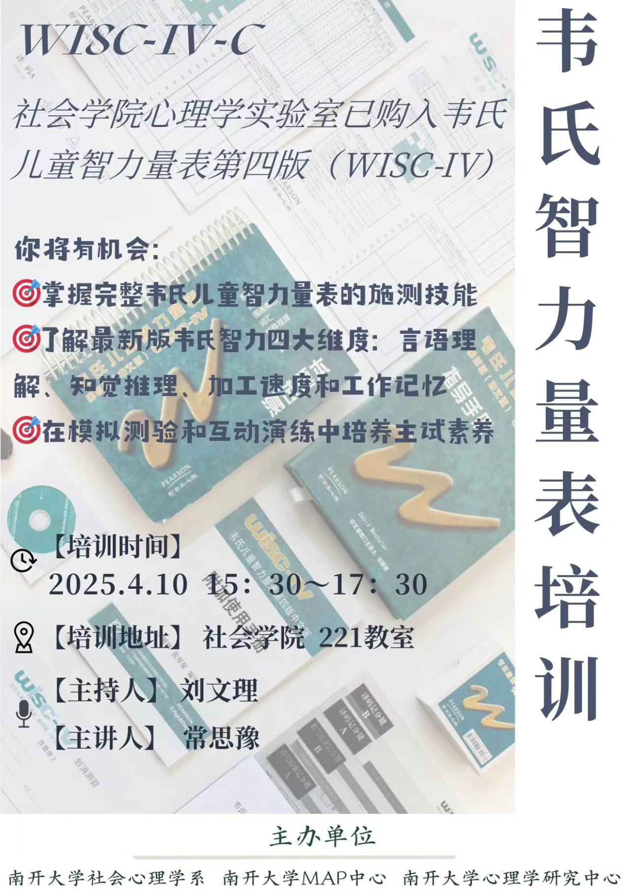 betway西汉姆联官网心理学实验室已购入韦氏儿童智力量表第四版(WISC-IV)。WISC-IV可用于儿童及青少年的认知能力评估,在特殊教育、心理咨询、学业支持、临床诊断及学术研究等多个领域均具有重要价值。为了帮助同学们更好地理解和应用该版智力测验,特组织一次学习交流会。本次交流会由一位经美国培生公司授权、具备WISC-IV主试资格的本院同学进行分享。