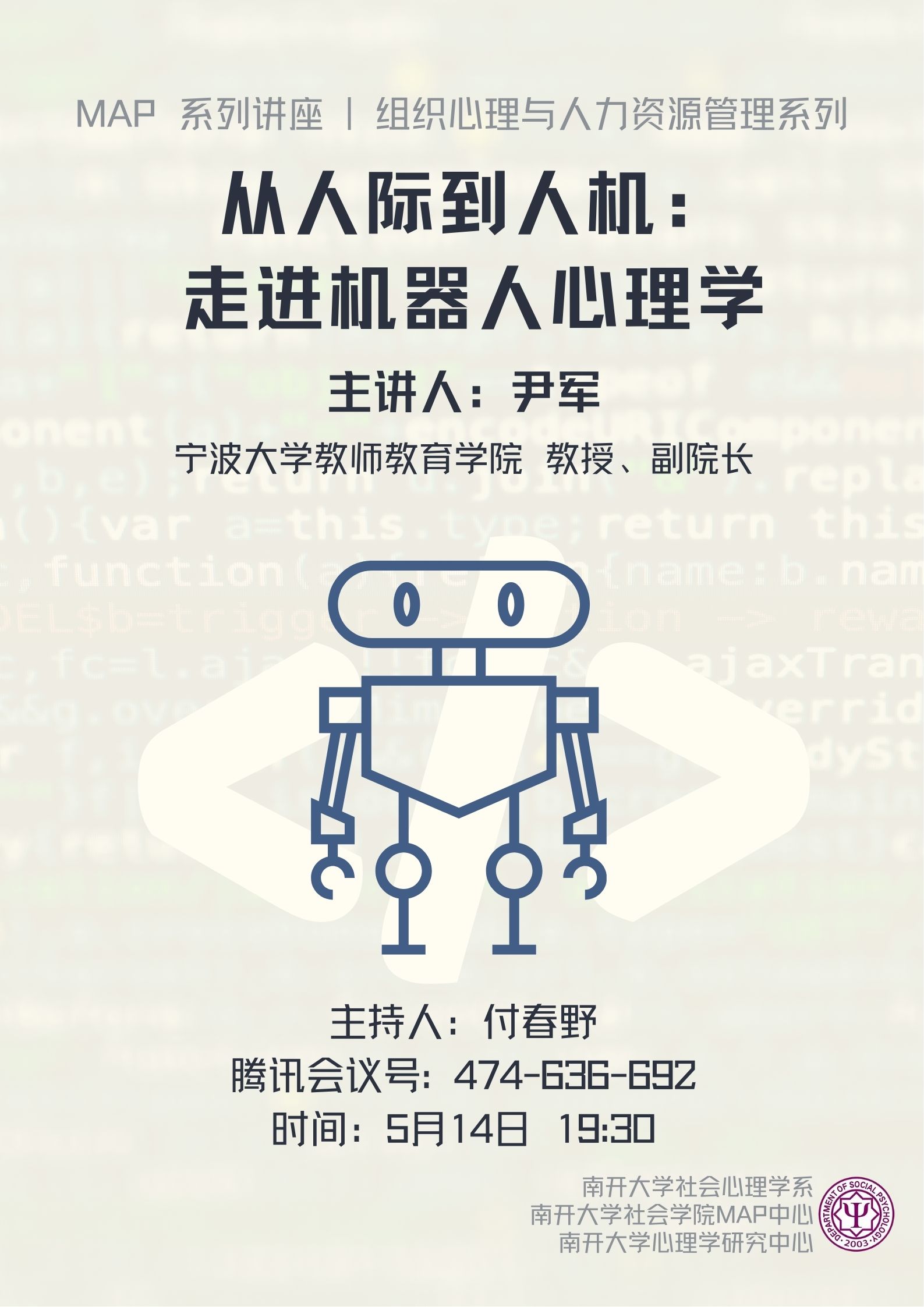 讲座题目:从人际到人机:走进机器人心理学