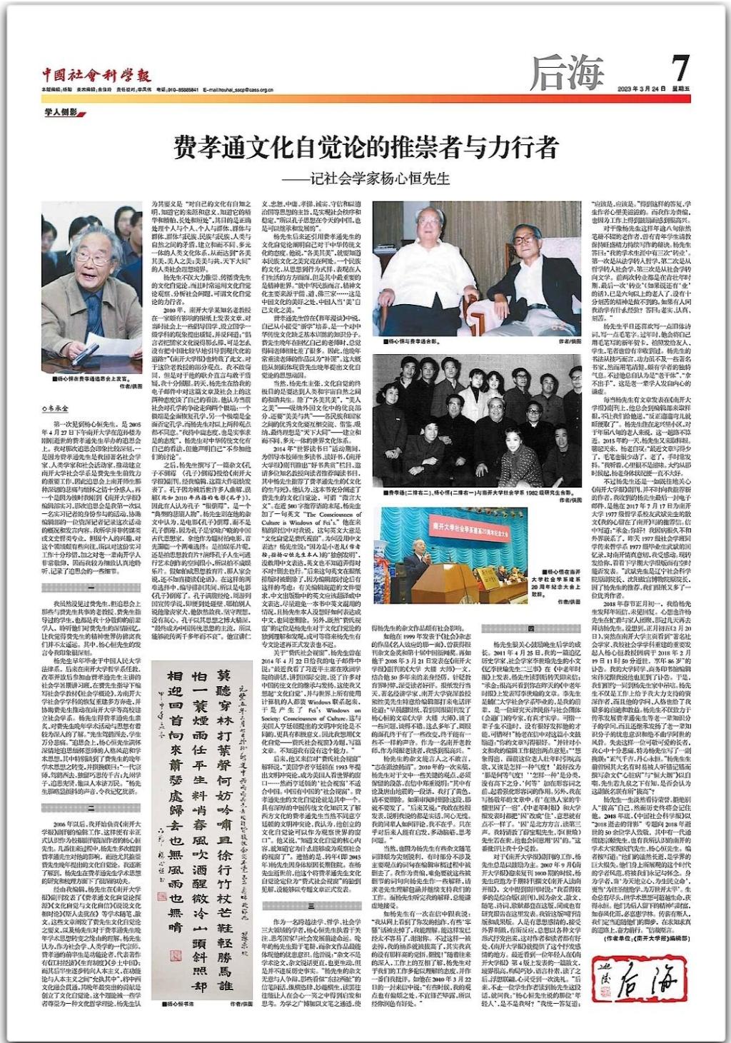 2006年以后,我开始负责《betway西汉姆联官网报》副刊的编辑工作,这样便有幸正式认识作为校报副刊资深作者的杨心恒先生。几番往来过程中,杨先生多次提到费孝通先生对他的影响,而他尤其推崇费先生晚年提出的文化自觉论。我逐渐了解到,杨先生在费孝通先生学术思想的研究和梳理方面下了很深的功夫。